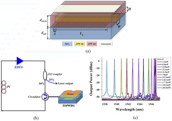 Optical waveguide Bragg grating, as a basic waveguide filtering element, can be utilized to select a certain wavelength for external cavity lasers [] or the channel selective receiver in the optical fiber network []. A tunable TO polymer waveguide Bragg grating (TOPWBG), with a structure as shown in Figure 18a, is fabricated using the imprinting technique []. The TOPWBG is measured with a reflectivity of 25 and 3 dB bandwidth of 0.8 nm. It is used as a wavelength selective filter in the ring laser system, as shown in Figure 18b. The established tunable laser exhibits an output of 4.1 dBm, side-mode suppression ratio of 55, and 3 dB bandwidth of less than 16 pm. By driving the heater with different powers, the laser wavelength can be tuned due to the TO tuning of the Bragg wavelength of the TOPWBG. The measured laser output spectra with different heating powers are shown in Figure 18c with the wavelength tuning range of 8.4 nm. According to the relationship between the heating power and the laser wavelength, a good linearity of about 32 pm/mW is obtained.