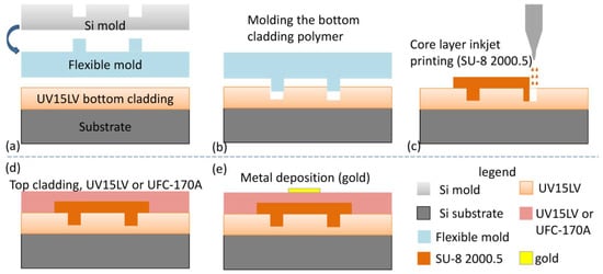 Process flow for fabricating a 2 × 2 thermo-optic polymer switch using imprinting and ink-jet printing method. (a) Silicon and flexible mold; (b) imprinting the bottom cladding; (c) core layer deposition; (d) top cladding deposition; and (e) metal electrode deposition []. Copyright 2013 OSA.