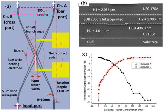 (a) Schematic showing the top view of the 2 × 2 TO TIR switch layout; (b) SEM cross-section view of printed layers in the TO polymer switch; (c) normalized optical output power versus electrical power from both bar port (Channel A) and cross port (Channel B) []. Copyright 2013 OSA.