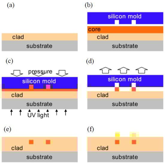 UV imprinting steps for integrated waveguide VOA-based on polymer materials. (a) Spin-coating and curing for under-cladding; (b) core material dispensing; (c) imprinting under pressure with UV irradiation; (d) detachment of the mold; (e) spin-coating and curing for cover-cladding; and (f) TO electrode patterning []. Copyright 2006 Elsevier.