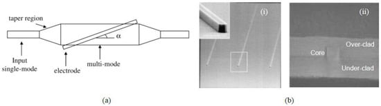 The polymer waveguide VOA, as shown in Figure 22a, comprises a single-mode waveguide channels, taper structures, and a multi-mode waveguide channel. Figure 22b shows the fabricated waveguides: (i) SEM picture of UV-imprinted single-mode waveguide core and (ii) cross-sectional view of the fabricated polymer waveguide. The propagation loss of the straight single mode is 0.35 dB/cm at a wavelength of 1.55 μm, and the average insertion loss is less than 2 dB. The attenuation characteristics according to the applied electrical power are measured with 30 dB attenuation with electrical power of 80 mW and a rising/falling time of less than 5 ms.