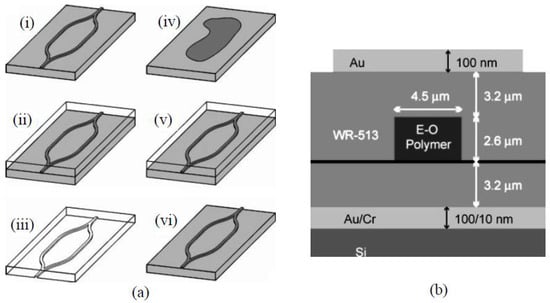 Incorporating the highly nonlinear and stable chromophore doped in amorphous polycarbonate, a MZI based EO intensity modulator is designed and fabricated using the UV imprinting technique []. In order to reduce the radiation loss of the Y junction, two S-shaped bends with radii of 1 mm are adopted. Figure 23a shows the process steps for the fabrication of PDMS stamp (i–iii) and the molding of EO polymer layer (iv–vi). The waveguide MZI structure is formed by the molding of the core polymer using the soft PDMS stamp. The polymer materitals with low refractive index for under cladding and upper cladding should be chosen carefully, because the solution solvent of core material must not dissolve the under cladding polymer, and the solution solvent of upper clading material must not dissolve the core polymer. The cross-sectional view of the electro-optic waveguide structure is illustrated in Figure 23b. The fabricated EO modulater is measured with the halfwave voltage (Vπ) of 8.4 V at 1600 nm, and the on/off extinction ratio is better than 19 dB. As the first imprinted EO polymer modulator, the halfwave voltage is relatively high. It could be improved by thinning the cladding layers in a push–pull fashion and optimizing the poling efficiency.