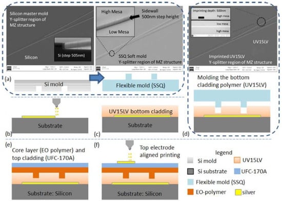 Despite utilizing imprinting to pattern one layer, other material layers (metal electrode) still need to be prepared via spin-coating, evaporation, etching, or lift-off methods, which increase the process complexity and cost. Chen’s group worked toward achieving an all-printable EO modulator []. They demonstrated an electro-optic polymer-based MZ modulator fabricated by utilizing advanced UV imprinting and aligned ink-jet printing techniques for patterning and layer deposition. The main process flow for fabricating the MZ modulator is illustrated in Figure 24.