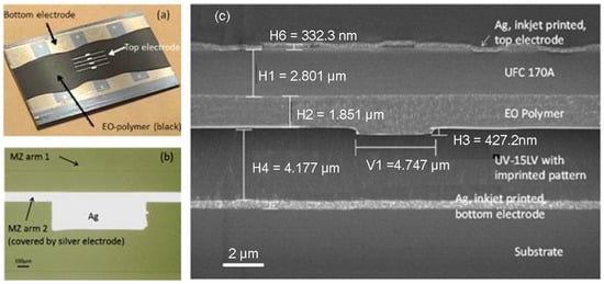 The bottom electrode layer is directly patterned on the substrate by ink-jet printing. By using the UV imprinting method with a transparent flexible mold, the waveguide structure is transfered into the under cladding polymer. All other layers are ink-jet printed step by step. The top electrode is printed over the MZI arm with alignment. Besides the requirement of materials to form a optical waveguide using the imprinting technique, the core material and the electrode material should have suitable viscosity to be ink-jet printed. Figure 25a,b shows the microscope image of printed EO polymer modulator and ink-jet printed top electrode, respectively. Figure 25c gives the SEM picture of the modulator cross section. It can be seen that the imprinted trench is filled with EO polymer, and the top and ground electrodes are uniformly deposited with the top electrode located right on top of the rib waveguide.