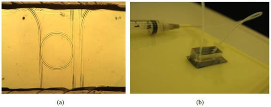 - Flores, A.; Song, S.; Baig, S.; Wang, M.R. Vacuum-assisted microfluidic technique for fabrication of guided wave devices. IEEE Photonics Technol. Lett. 2008, 20, 1246–1248. [Google Scholar] [CrossRef]