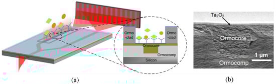 Polymers, which have the advantages of low cost, flexile tuning of their refractive index, and a designable function with synthetization at the molecular level, have promising applications for fabricating photonic integrated waveguide devices [,,,,]. Showing the high thermal-optic (TO) and electro-optic (EO) coefficients, they are excellent materials for low-power TO functional devices and low half-wave voltage, high-bandwidth EO modulators [,,]. With the direct physical adsorption of proteins on the waveguide surface or their immobilization in a covalent way, they are also desirable materials for label-free optical biosensors [,,,]. In addition, due to their good compatibility on diverse substrates, they provide good platforms for the hybrid integration of photonic chips [,,].