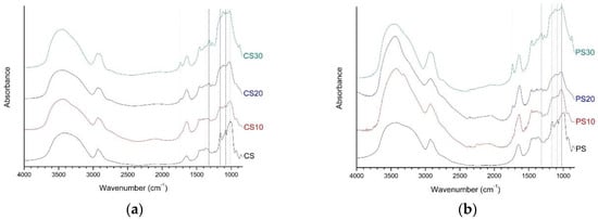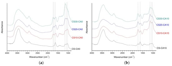 The FT-IR spectra of polysaccharide-based SAPs: (a) CS-CA0, CS10-CA0, CS20-CA0, CS30-CA0; (b) CS-CA10, CS10-CA10, CS20-CA10, CS30-CA10.