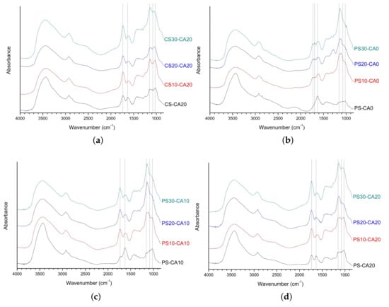 The FT-IR spectra of polysaccharide-based SAPs: (a) CS-CA20, CS10-CA20, CS20-CA20, CS30-CA20; (b) PS-CA0, PS10-CA0, PS20-CA0, PS30-CA0; (c) PS-CA10, PS10-CA10, PS20-CA10, PS30-CA10; (d) PS-CA20, PS10-CA20, PS20-CA20, PS30-CA20.