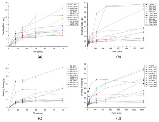 The swelling ratios of polysaccharide-based SAPs using corn starch series (a,b) and potato starch series (c,d): the initial swelling in 2 h (a,c) and the whole swelling in 24 h (b,d) (mean ± SD, n = 5).