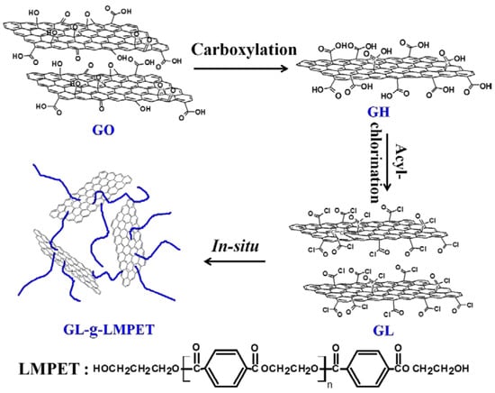 Lastly, preparation of GL-g-LMPET: 11.2 g DMT (dimethyl terephthalate), 7 mL EG (ethylene glycol) and a small amount of zinc acetate were mixed in a three-necked flask and reacted under 190 °C for 2 h. After that, trace amounts of Sb2O3 used as catalyst and 0.5–1 drops of triphenyl phosphate acted as thermal stabilizer were added into the mixture, and further stirred for 1 h followed by the addition of 10 mg GL. The mixture was then heated to 230 °C and allowed to remain for 2 h. The obtained mixture was centrifuged and washed using phenol/carbon tetrachloride (m:m = 1:1) to remove ungrafted LMPET. Finally, the product was dried under vacuum at 80 °C for 24 h. Additionally, graphene oxide—LMPET (GO-g-LMPET) was prepared using a similar method (Figure 1) using GO without functionalization.