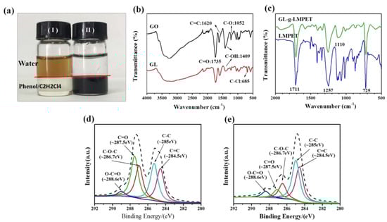 (a) solubility of GO (I) and GL-g-LMPET (II) in H2O (up)/ Phenol and C2H2Cl4 (down) solution; (b) FTIR spectra of GO and GL; (c) FTIR spectra of GL-g-LMPET and LMPET; XPS spectra (C1s) of GO (d) and GL-g-LMPET (e).