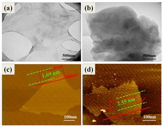 TEM was utilized to investigate the microstructure of GO and GL-g-LMPET. Figure 3a reveals a transparent, clean surface of GO with some thin ripples. As is reported in previous literature, folds are an inherent property of graphene sheets, owing to the instability of the two-dimensional plane [34]. After functionalization, the TEM image of GL-g-LMPET is entirely different as shown in Figure 3b. We can clearly observe that the surface of GO sheets is covered by a thin coating, and this morphology is similar to the case of polymer-functionalized graphene or carbon nanotubes [35,36], which can be attributed to the LMPET chains grafted onto GO sheets, forming polymer grafting interface structures. Moreover, it is worth noting that the slightly aggregated structures of GL-g-LMPET sheets can be also observed in Figure 3b, which can be attributed to two main reasons: (1) strong π–π stacking between layers have a non-negligible attraction to each other, and (2) each LMPET chain has two terminal hydroxyl groups that would induce LMPET chains to inevitably graft onto two GOs. In short, the polymer interface layer can be successfully created. To further characterize the morphology of GO before and after modification, AFM was applied to characterize the thickness of GO and GL-g-LMPET monolayers [11]. As seen in Figure 3c,d, the thicknesses of GO and GL-g-LMPET were 1.09 and 1.65 nm, respectively. Thus, it has also been confirmed that the functionalization process has changed the morphology of GO sheets.