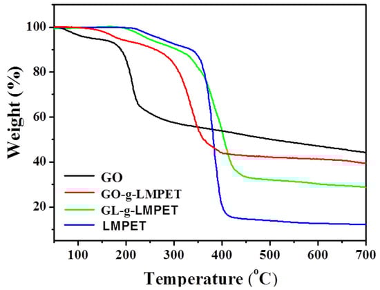 The grafting content of LMPET was characterized using TGA, as shown in Figure 4. The weight loss of GL-g-LMPET can reflect the grafted LMPET molecular chains content to a certain degree due to the fact that the synthesized nanosheets were Soxhlet extracted for 72 h to remove unreacted polymers. For the TGA curve of GO, the initial mass loss appeared at around 100 °C, mainly attributing to the evaporation of water molecules adsorbed on the surface of GO. The major weight loss of GO appeared at 150~200 °C, which was caused by the pyrolysis of GO sheets [37]. However, it is observed that the major weight loss of the GO-g-LMPET and GL-g-LMPET are completed at 270~370 °C and 350~430 °C, respectively, which occurs later than that of the GO, illustrating that the grafting LMPET is effective for enhancing the thermal stability of GO [38]. Moreover, based on the char residue of GO (45 wt %), GO-g-LMPET (40 wt %) and GL-g-LMPET (27 wt %) under 700 °C, the weight percent of grafted LMPET onto GL and GO nanosheets were roughly calculated as 18 and 5 wt %. The comparatively higher grafting content of GL-g-LMPET may be benefited from the high active precursors (GL with multiple reactive sites).