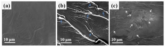 It is well known that the good dispersion of nanoparticles and the strong interfacial interaction are two important factors to improve the physicochemical properties of nanocomposites modified polymer. SEM was applied to investigate the dispersion and interface of various nano-GO into the polymer matrix. Figure 5 shows the freeze-fractured surfaces of PET nanocomposites obtained at liquid nitrogen temperature. The roughness of all nanocomposites fractured surface is relatively higher compared with that of pure PET. Aggregates can be clearly seen in Figure 5b, indicating inhomogeneous dispersion of GO in PET matrix. In addition, some obvious gaps are observed on the surface (Figure 5b, blue arrows). This phenomenon can be explained that the interfacial interaction between the GO and the PET matrix is not ideal. By comparison, the PET/GL-g-LMPET nanocomposites in Figure 5c show that many smaller dimples on the fracture surface and GL-g-LMPET sheets can be well dispersed in the matrix, as no large agglomerates can be found. This demonstrates that the interface between GL-g-LMPET sheets and the PET matrix is stronger than that in the PET/GO and PET/GO-g-LMPET nanocomposites.
