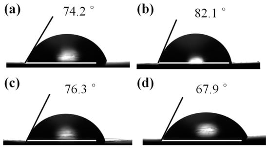 Pictures of water droplets on various nanocomposites: (a) pure PET; (b) PET/GO; (c) PET/GO-g-LMPET; and (d) PET/GL-g-LMPET.
