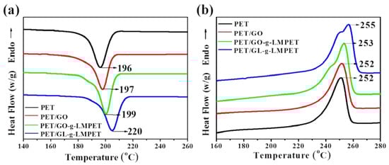 The heating curve (a) and the cooling curve (b) of pure PET, PET/GO, PET/GO-g-LMPET and PET/GL-g-LMPET at the rate of 10 °C·min−1.