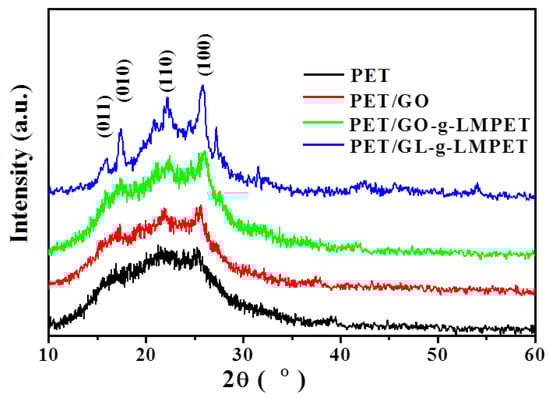The XRD patterns provide important insight into the effects of GO, GO-g-LMPET and GL-g-LMPET on the crystalline structure of PE in Figure 8. It is known that nanofillers have a significant effect on the crystallization ability of semi-crystalline polymers [43,44]. Thus, various nano-GO, as the heterogeneous nucleus, was introduced in the present work. Compared to pure PET, the four sharp peaks appeared at 2θ ≈ 16.4°, 17.8°, 22.8° and 26.1° on the XRD curves of PET/GO, PET/GO-g-LMPET and PET/GL-g-LMPET, corresponding to the (011), (010), (110) and (100) diffraction planes, respectively [30]. This is clear proof for improved crystallinity of the nanocomposites. In addition, the intensity of diffraction peaks is gradually enhanced with the nanofillers addition of GO, GO-g-LMPET and GL-g-LMPET. It indicates that GL-g-LMPET acts as a kind of more high-effect nucleating agent to improve the crystallization ability of PET. To further investigate the crystallinity of PET and PET nanocomposites, the relative crystallinity XC was calculated by Equation (2) and listed in Table 2. The results obtained agree with the outcome of XRD, the PET/GL-g-LMPET nanocomposite exhibits the optimal crystallization behavior and its crystalline increased by 6% more than pure PET.