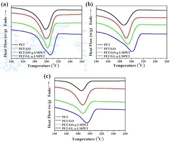 The effect of different nucleating agents on thermal behavior of PET matrix during heating and cooling processes was characterized by DSC [41,42], as shown in Figure 7. The corresponding data were listed in Table 2. From Figure 7a, we can find that the melting temperature (Tm) of PET/GL-g-LMPET nanocomposites notably increased as compared with those of pure PET, PET/GO and PET/GO-g-LMPET, whereas the PET/GO and PET/GO-g-LMPET only performed trivial changes. Figure 6b depicts the heating process of PET nanocomposites. Due to the nucleation effect of various nano-GO, the perfection degree of PET crystals increased, leading to the melting temperature increase. Interestingly, double melting peaks appeared when GL-g-LMPET was added into the PET matrix. The lower melting temperatures of PET nanocomposites were similar with that of PET, suggesting that the lower Tm was caused by the crystals of PET. For the higher melting temperature (Tm), the perfection degree of crystals was relatively high, which may be caused by the crystals of PET/ GL-g-LMPET. Moreover, SEM of GL-g-LMPET can further clarify the two different kinds of PET crystals in nanocomposites (Figure 5d). GL-g-LMPETs were dispersed homogeneously in the PET matrix (as pointed at by white arrows), demonstrating a strong interaction between GO nanosheets and PET matrix. Thus, two different regions appeared in the PET matrix, namely GO surrounded by PET molecular and PET without GO. The former region formed crystals with higher perfection due to the strong interaction between GO and PET moleculars compared with that of the PET region, leading to the appearance of two different melting temperatures.