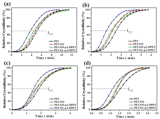 Another criterion commonly used to evaluate crystallization property is the crystallization rate of nanocomposites. DSC of all the samples at different cooling rates were performed and relevant results are presented in Figure 7a and Figure 9. At the same cooling rate, Tmc shifted to higher values gradually with the addition of the nucleating agents GO, GO-g-LMPET and GL-g-LMPET. Based on the above DSC crystallization curves and Formula (2), non-isothermal crystallization process of PET and its composites at different cooling rates were obtained and shown in Figure 10. Moreover, we adopted an important parameter, the value of t1/2, to characterize the crystallization rate (the time at which the relative crystallinity of the polymers achieves 50% of the total crystallinity measured at that temperature and can reflect the overall crystallization rate of the polymers), and the lower t1/2 values indicate higher crystallization rate. Obviously, at the same cooling rate, the t1/2 values decreased in the order of PET/GO, PET/GO-g-LMPET and PET/GL-g-LMPET. PET/GL-g-LMPET achieving the higher crystallization rate is attributed to the good dispersion and strong interfacial adhesion of GL-g-LMPET in PET.
