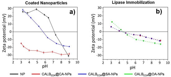 Zeta potential values vs. pH of (a) CA and SA coated NPs compared with uncoated NPs and of (b) CALBEDA@CA-NPs, CALBEDA@SA-NPs and CALBEDA@OA-NPs.
