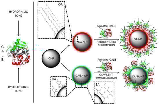 Controlled immobilization of chemically modified CALB on tailor-made magnetic iron oxide nanoparticles (IONP). (OA: oleic acid; CA: citric acid; SA: succinic anhydride).