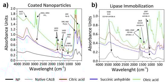 Fourier transform infrared spectra (FTIR) spectra of (a) CA, SA and OA coated NPs compared with the naked one and of (b) CALBEDA@CA-NPs, CALBEDA@SA-NPs and CALBEDA@OA-NPs.