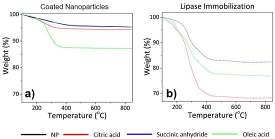 The presence of the enzyme on NPs surface was confirmed by FTIR and TGA (Figure 3b and Figure 4b). The IR spectra of the three immobilization types showed peaks of amide groups due to the polypeptide chain of proteins. The peak around 3420 cm−1 was broader than the spectra of coated-NPs (Figure 3b) due to the contribution of N-H stretching in primary amines at 3280 cm−1, which is characteristic of the amide A region [58,59]. The other peaks that appear at 1662, 1540, 1415 and 1067 cm−1 are assigned to amides I, II and III vibration region, characteristic of secondary structures of proteins, (β-sheet, unordered, α-helical and turns structures), and the symmetrical bending of the N–H bonds corresponding to the NH3+ group of the amino acids [59]. TGA analysis showed a weight loss of 24%, 12% and 11% for the lipase immobilized in CA, SA and OA-coated NPs, respectively (after eliminating the contribution of each surface coating) (Figure 4b). The weight losses here obtained are in agreement with the immobilization yields previously calculated.