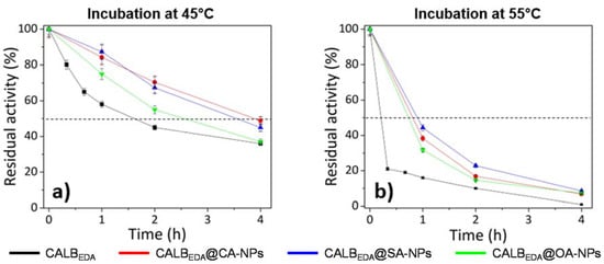 Independently of the selected heating strategy, one of the goals of this research was focused on the assessment of the impact of immobilization protocol on nanobiocatalyst thermal stability, especially in order to evaluate its potential applicability in high temperature bioprocesses. With this aim, all the three lipases immobilized on magnetic IONPs, together with the free CALBEDA lipase as control, were incubated at 45 and 55 °C during different times and the retained activity was evaluated by hydrolysis of pNPB (Figure 5). At 45 °C, thermal stability of both CALBEDA@CA-NPs and CALBEDA@SA-NPs covalent derivatives was quite similar, being about 4 h the half-life time (Figure 5a). The CALBEDA@OA-NPs was less stable, reaching the half-life after 2.5 h (Figure 5a). However, all immobilized catalysts were revealed to be more thermostable than free CALBEDA since the half-life of this last was reached after 1.5 h (Figure 5a). During incubation at 55 °C, the general trend above described was respected but with faster kinetic of thermal inactivation. In fact, all the nanoderivatives reached half-life values within 45 min and 1 h whereas the free enzyme reached that value only after 10 min incubation (Figure 5b). This general trend of thermal stability results (immobilized enzyme more stable than free enzyme and covalent immobilization catalysts more stable than physical adsorption) was in agreement with similar results reported in literature [61].