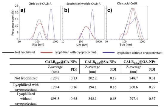 Colloidal properties CALBEDA-NPs in suspension and after lyophilization. Hydrodynamic sizes of CALB-immobilized NPs after storage in two different forms: aqueous suspension and freeze-dried. Lyophilized samples, with or without cryoprotectant (red and blue lines) and stored at 4 °C, were re-suspended in phosphate buffer 10 mM before the experiment. (a) Hydrodynamic size of CALBEDA@CA-NPs, (b) hydrodynamic size of CALBEDA@SA-NPs and (c) hydrodynamic size of CALBEDA@OA-NPs.