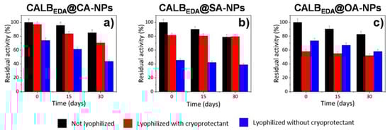 The presence of the cryoprotectant during freeze-drying produced an initial activity decrease of the enzyme in a different extent depending on the immobilization protocol applied. For example, the CALBEDA@OA-NPs hydrophobic derivative underwent to the greatest activity decrease (−40% loss) (Figure 7c) whereas the CALBEDA@CA-NPs and CALBEDA@SA-NPs covalent derivatives only loss their initial activity in a 5% (Figure 7a) and 20% (Figure 7b) values respectively. In all cases, this initial activity drop was roughly maintained during one month of storage (Figure 7).