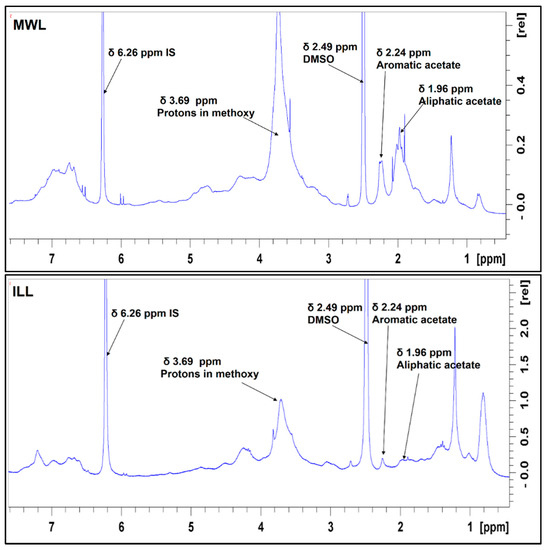 1H NMR spectra of lignin isolates (MWL, ILL and EOL) revealing acetate of varying intensity.
