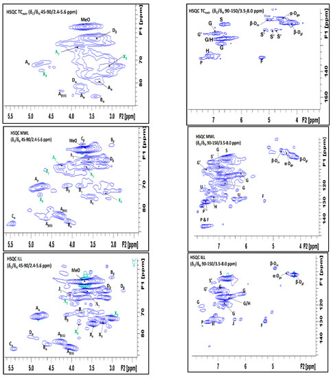 HSQC Spectra showing side chain and aromatic/unsaturated regions for TCextr and TC lignin isolates (MWL, ILL and MWL), assignment in Table S2 (Supplementary Materials). Key: Symbols for acetylated units are in green highlight; β-O-4 alkyl-aryl ethers, including Cγ-Hγ in γ-acetylated β-O-4′ substructures (A); Resinols (B); Phenylcoumarans (C); Spirodienone (D); Cinnamyl alcohol end groups, include Cγ-Hγ in cinnamyl acetate end groups (J); p-coumaric and ferulic acids (P&F); β-d-Mannosyl (mannose residues) (β-Dm); α-d-Galactosyl (galactose residues) (α-Dga); β-d-Glucosyl (Glucose residues) (β-D); C2−H2 in 2-O-acetyl-β-d-xylopyranoside (X2); C3−H3 in β-d-xylopyranoside (X3); C4−H4 in β-d-xylopyranoside (X4); Unknown (U).