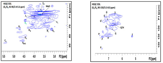 In TCextr, MWL and ILL, correlations associated with polysaccharides were observed, assigned to anomeric β-d-glucosyl (δC/δH 102.0/4.24 ppm), β-d-mannosyl (δC/δH 98.4/4.84 ppm) and α-d-galactosyl (δC/δH 99.4/4.45 ppm) units. Interestingly, acetate groups linked to polysaccharides were detected at δC/δH 73.2/2.87 and 74.5/4.73 ppm, and assigned to C2-H2 correlations in 2-O-acetyl-β-d-xylopyranoside and C3-H3 in 3-O-acetyl-β-d-xylopyranoside, respectively. For EOL, the low concentration of sugars in the spectra suggests an extensive hydrolysis of polysaccharides under the acidic conditions used as revealed earlier by sugar analysis [16].