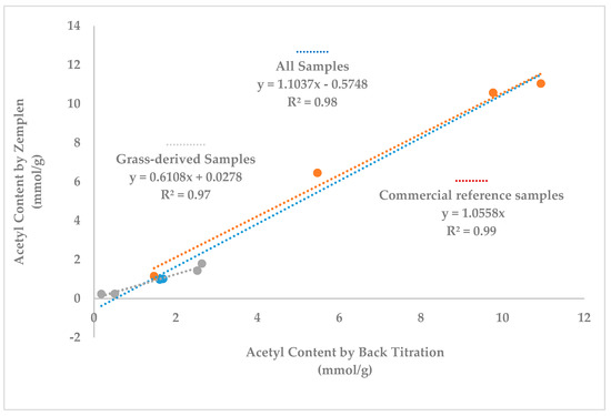 Corrrelations between acetyl contents measured by Zemplén and back titration methods validating the accuracy and sensitivity of the Zemplén method for acetate analysis in lignocellulosics.