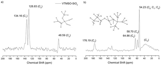 Solid-state 13C NMR spectrum of VTMSO-SiO2 (a) and Q/VTMSO-SiO2 (b). Inset: structure details with signal assignment.