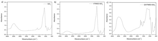 Therefore, the processing FT-IR spectroscopy was performed for SiO2, VTMSO-SiO2 and Q/VTMSO-SiO2 to examine their chemical structures. These spectra are compared in Figure 3a–c, respectively. In all samples there were strong characteristic absorption peaks that were assigned to the silane carbon bonds, Si–CH at 800 cm−1 and absorption peaks at around the 1100 cm−1 region characteristic of the methoxy groups Si–OCH3 and any siloxane cross-links (Si–O–Si) that were formed during the silylation of silica by VTMSO. Also, we observed the absorption bands of OH stretching at 3432 cm−1 and H–O–H bending at 1634 cm−1characteristic of silica. It is important to note that in the FT-IR spectra of VTMSO-SiO2 the signal corresponding to the vinyl group overlapped due to the intensity of the other silica signals.