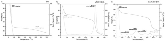 TG-DTG thermograms of SiO2 (a), VTMSO-SiO2 (b), and Q/VTMSO-SiO2 (c).