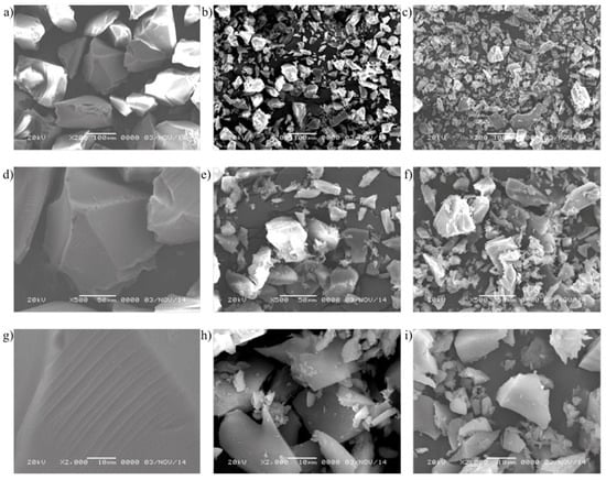 Morphologies of the silica particles before/after were observed to examine the difference in morphologies aroused by the VTMSO coating and Q grafting, respectively. Figure 6 shows the SEM images of SiO2, VTMSO-SiO2, and Q/VTMSO-SiO2 with different magnifications. The silica particles looked like a crystal had an irregular cubic shape and a polydispersed size. In addition, the silica particles had a smooth and clean surface. After modification by VTMSO and Q, the particle surface became rougher and decreased in size, but they maintained their irregular shape (see Figure 6b). It is important to note that the addition of Q over silanized silica particles decreased in size even more. This is because the surface of Q/VTMSO-SiO2 contained a large number of quaternary ammonium groups that did not interact and the OH groups of silica decreased dramatically. Finally, the particle surface was covered with nanoscale lumps, which were believed to be the VTMSO and poly(Q) coating in the case of VTMSO-SiO2 and Q/VTMSO-SiO2, respectively.