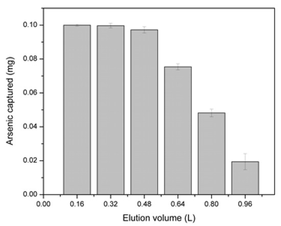 In Figure 7, the results of affinity assays between Q/VTMSO-SiO2 and model arsenic solution are shown. In elutions 1 and 2, the cartridge was able to capture all the arsenic present in the model solution. In the third elution, the capture capacity of the cartridge decreased to 97.7%. The fourth elution showed a capture capacity of 74.9%. In the fifth elution, the cartridge capture capacities fell to 48.2%. Finally, in the sixth elution, the cartridge capture capacities were only 19%.