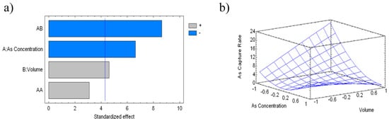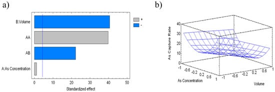 (a) Standardized Pareto chart for As capture rate, due to commercial polymer treatment (where: A, As concentration; B, Eluted volume; and AB, AA and BB interactions. Blue line represents critical t-value, 95% confidence); and (b) estimated response surface.