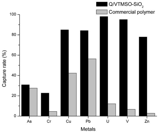 Finally, considering the experimental conditions in which the commercial polymer presented a better performance, the experimental conditions of the second experiment (Table 1 and Table 2) were selected and the affinity of both polymers to other metals present in the drinking water was determined. The results are shown in Figure 10. It is observed that the commercial polymer has a lower affinity than Q/VTMSO-SiO2 for all the metals present in the drinking water used.