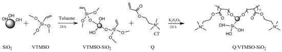 Free-radical graft polymerization of acryloxyethyl-trimethylammonium chloride (Q) onto VTMSO-silylated particles was carried out in a necked flask using 0.01 M of K2S2O8 as initiator (Scheme 1). The initial monomer concentration (Q) was 80% of VTMSO-silylated particles weight using a predetermined volume of water. The reaction was performed under a nitrogen atmosphere at 60 °C, using magnetic stirring overnight. After the reaction time, the reaction mixture was filtered and washed with water to eliminate the excess of unreactive Q. Finally, the acryloxyethyl-trimethylammonium chloride on VTMSO-silylated particles (Q/VTMSO-SiO2) was dried under a vacuum until constant weight was attained. The grafting percentage of modified silica was determined by thermogravimetric analyses. The percentage of acryloxyethyl-trimethylammonium chloride based on VTMSO-silylated particles was calculated by the following equation [35]: