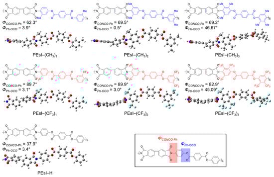 The chemical structures of the repeat units and the three-dimensional (3D) molecular structures of the model compounds for the seven PEsI models used in this study are shown in Figure 1. The seven PEsIs were synthesized from 3,3′,4,4′-biphenyltetracarboxylic dianhydride (BPDA) and corresponding diamines (i.e., bis-(4-amino-phenyl) terephthalate (BAT), bis-(4-amino-3-methyl-phenyl) terephthalate (BAMT), bis-(4-amino-3,5-dimethyl-phenyl) terephthalate (BADMT), bis-(4-amino-2,3,5,-trimethyl-phenyl) terephthalate (BATMT), bis-(4-amino-3-trifluoromethyl-phenyl) terephthalate (BATFMT), bis-(4-amino-3,5-bis-trifluoromethyl-phenyl) terephthalate (BABTFMT), and bis-(4-amino-2,3,5-tris-trifluoromethyl-phenyl) terephthalate (BATTFMT). For convenience, the PEsI models are denoted as PEsI–(CH3)1 for BPDA–BAMT, PEsI–(CH3)2 for BPDA–BADMT, PEsI–(CH3)3 for BPDA–BATMT, PEsI–(CF3)1 for BPDA–BATFMT, PEsI–(CF3)2 for BPDA–BABTFMT, and PEsI–(CF3)3 for BPDA–BATTFMT. To confirm the substituent effect, a controlled sample was prepared and labeled as PEsI–H (BPDA–BAT). To illustrate their respective possibilities, a series of PEsI–(CF)x models, which were not yet synthesized, but have great potential as next-generation transparent plastic substrates, was included in this study. The PEsI–(CF)x series involves modifications of the corresponding PEsI–(CH3)x counterparts instead of –CH3 groups per repeat unit. Each substituent was located at the ortho- and meta-positions of the amino groups.