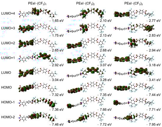 In order to gain insight into the coloration of the PEsIs, the software package Gaussian 09 was used for the DFT calculation []. Figure S1 shows a theoretical calculation of the three-dimensional (3D) molecular structures of the PEsIs, and their molecular orbital (MO) diagrams. Figure 3 provides details of the quantum-chemical calculations, molecular orbital diagrams, and calculated electronic transitions of the model compounds for the three representative systems—PEsI–(CF3)1, PEsI–(CF3)2, and PEsI–(CF3)3—at the optimized S0 geometry. The model compounds were composed of the basic units of the polymers, and their electronic transitions were calculated using the Becke, three-parameter, Lee-Yang-Parr (B3LYP) level with the 6-31G basis set []. Irrespective of the nature of the tetracarboxylic dianhydride, the calculated dihedral angles of a series of PEsI–(CF3)x between the –CF3-substituted phenylene ring and the imide ring at round states were in the range of 82.9–89.9°, which was significantly larger than the dihedral angles observed in the unsubstituted PEsI–H and –CH3-substituted PEsI–(CH3)x system. Note that the steric hindrance, caused by the bulky –CF3 groups directly attached to the aromatic BAT, forced the imide bond to be almost perpendicular, thereby causing significant conformational distortion of the PEsI backbones. The greater dihedral angle of the PEsI–(CF3)x model was caused by the steric hindrance of the –CF3 groups, which reduced the close chain packing, resulting in a more colorless and transparent nature. Furthermore, the more twisted structure of the PEsI–(CF3)x model resulted in largely isolated electronic states of the molecular orbitals. The number of –CF3 groups had a greater influence on the optical properties than their positions in the PEsI backbone. The results showed that the judicious introduction of electron-withdrawing –CF3 groups to the diamine moiety of PEsIs, which had considerable steric hindrance on the backbone, was quite effective at eliminating or at least reducing the characteristic coloration of the aromatic PEsIs.