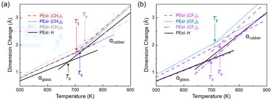 Plots of dimension change versus temperature obtained from molecular dynamics (MD) simulations. (a) –CH3- and (b) –CF3-substituted PEsI systems.