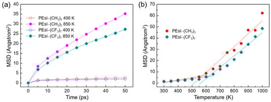 (a) Mean-square displacement (MSD) curves as a function of time for PEsI–(CH3)1 and PEsI–(CF3)1 at 400 and 850 K. (b) MSD curves as a function of temperature at 50-ps time intervals for the unit cells of the PEsI–(CH3)1 and PEsI–(CF3)1 systems.