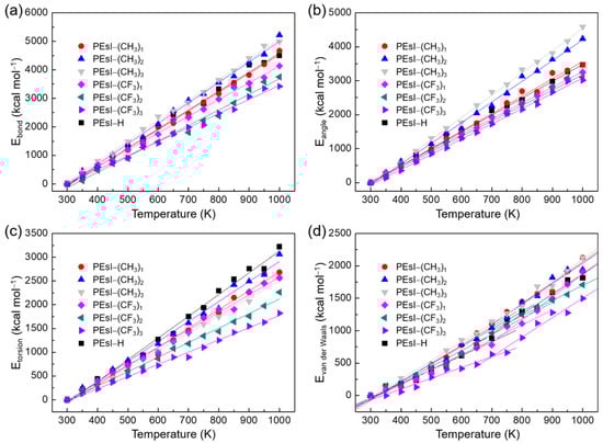 Plots of potential energy components versus temperature of the PEsI systems. (a) Bond stretching energy (Ebond), (b) angle variation energy (Eangle), (c) dihedral torsional energy (Etorsion), and (d) van der Waals energy (EvdW).
