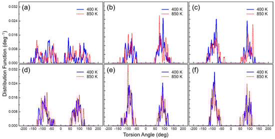 Torsion angle distributions of the PEsI systems obtained from the MD simulations at 400 and 850 K. (a) PEsI–(CH3)1; (b) PEsI–(CH3)2; (c) PEsI–(CH3)3; (d) PEsI–(CF3)1; (e) PEsI–(CF3)2; and (f) PEsI–(CF3)3.