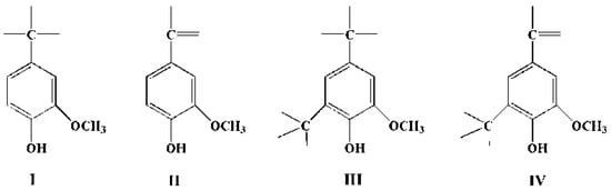 Difference UV spectrophotometry is a sample method used to determine the content of phenolic hydroxyls in lignin. This method is mainly based on the dissociation of phenolic hydroxyl in alkaline solution [,]. A sample of 10–15 mg of lignin was weighted and dissolved in 10 mL of dioxane, and a 2 mL solution was expanded to 50 mL by using a NaH2PO4/NaOH buffer solution (pH = 6) and a 0.2 mol/L sodium hydroxide solution. Optical densities at λ (wavelength) = 300 and 360 nm were recorded with a T6 UV-vis spectrophotometer (UV) provided by Beijing Purkinje General Instrument Co., Ltd. (Beijing, China). A 0.2 mol/L NaOH solution was measured as a sample, and the buffer solution was considered a blank sample in the testing. Phenolic hydroxyl groups with different structures are shown in Figure 1.