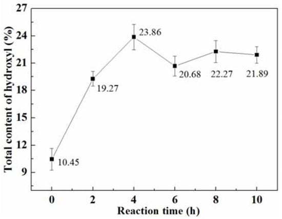 The total hydroxyl content of lignin was determined by acetylation titration and the results are shown in Figure 2. Figure 2 shows that the total hydroxyl content obviously increased after hydroxylation reaction and the maximum value of 23.86% was achieved at a reaction time of 4 h, which was more than double the original lignin total hydroxyl content. Hydroxymethyl (–CH2OH) and aldehyde (–CHO) groups were introduced to the active site of benzene rings in the process of the modification. Therefore, the increase of the hydroxyl groups indirectly indicated the occurrence of a glyoxalation reaction. However, there was no significant change in hydroxyl content after the 4 h reaction time. Secondary polycondensation reactions between glyoxal and lignin molecules may be responsible for the decrease in hydroxyl content.